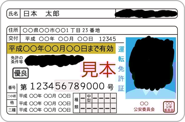 生年月日・顔写真・免許の条件・臓器提供意思・性別の部分は、下の見本のように黒塗りやスタンプで隠すか、紙や指などで物理的に覆い隠してください。